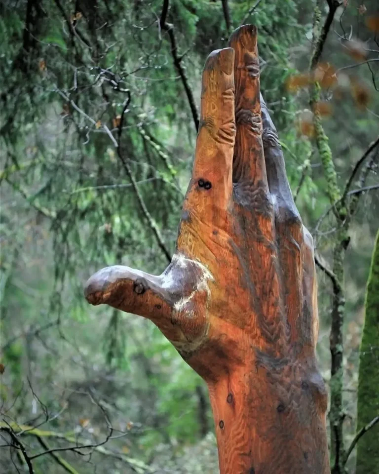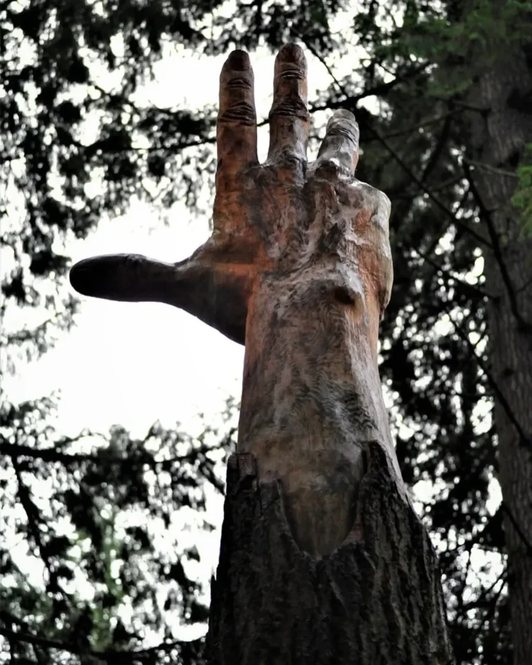 Alih-alih pohon itu dibersihkan atau ditebang habis, seniman asal Wales, Simon O’Rourke (@simonorourke), memutuskan mengukir ulang batang raksasa itu menjadi karya seni monumental. Dari batang besar setinggi puluhan meter tersebut, ia menciptakan figur tangan kolosal yang seolah bangkit dari tanah dan menjulang ke arah langit. Karya ini diberi nama “The Giant Hand of Vyrnwy,” sebuah judul yang mencerminkan skala dan makna simbolis dari patung tersebut.