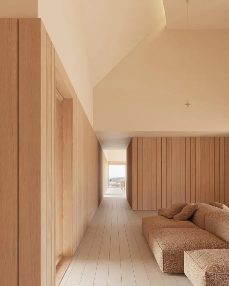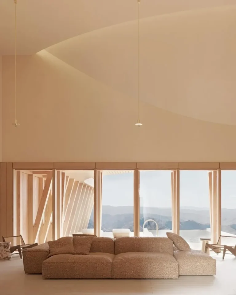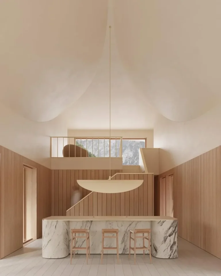 Interior rumah dirancang oleh Kanstantsin Remez dan divisualisasikan oleh mir.no, dengan pendekatan yang menekankan kehangatan dan kontinuitas bentuk. Tata ruang dalam mengikuti geometri bangunan, menghadirkan sudut-sudut lembut dan sirkulasi yang mengalir. Palet warna netral, tekstur kayu, serta pencahayaan alami mendominasi ruang, menciptakan suasana domestik yang tenang dan intim.
