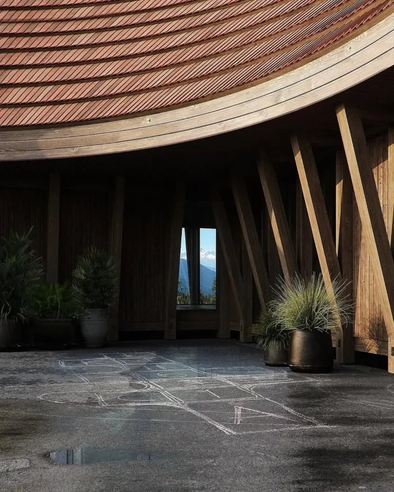 Secara skala, rumah ini dirancang dengan proporsi yang menyesuaikan kontur lahan pegunungan. Massa bangunan dibuat rendah dan memanjang, sehingga tidak mendominasi lanskap sekitarnya. Material alami seperti kayu, batu, dan beton ekspos digunakan untuk menciptakan transisi visual yang lembut antara arsitektur dan alam, sekaligus memberikan ketahanan terhadap iklim pegunungan yang ekstrem.