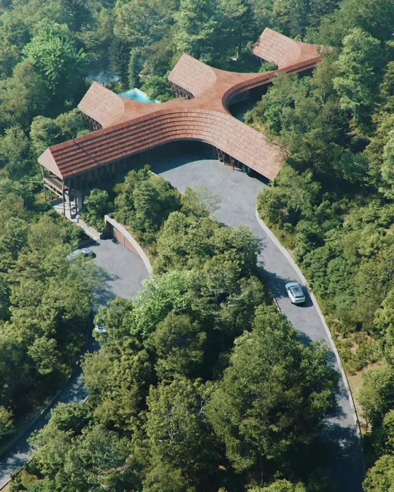 Bentuk bangunan terdiri dari tiga sayap utama yang menyebar dari satu pusat, menyerupai cabang pohon yang tumbuh alami dari tanah. Setiap sayap difungsikan sebagai unit hunian semi-mandiri, memungkinkan orang tua, anak, dan anggota keluarga lainnya memiliki ruang tinggal yang nyaman tanpa kehilangan kedekatan. Konfigurasi ini menciptakan jarak visual dan akustik yang optimal, sekaligus memudahkan sirkulasi antar-ruang.