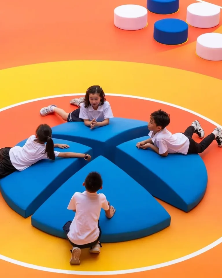 Area ini mencakup berbagai elemen yang bisa digerakkan atau dipindahkan, mulai dari blok berbentuk balok, panel miring, hingga platform kecil untuk melompat dan memanjat. Dengan desain yang aman serta fleksibel, seluruh modul dapat disesuaikan antar anak dari kelas berbeda, menjadikan taman bermain ini inklusif bagi seluruh siswa sekolah, yang berjumlah ratusan setiap harinya.