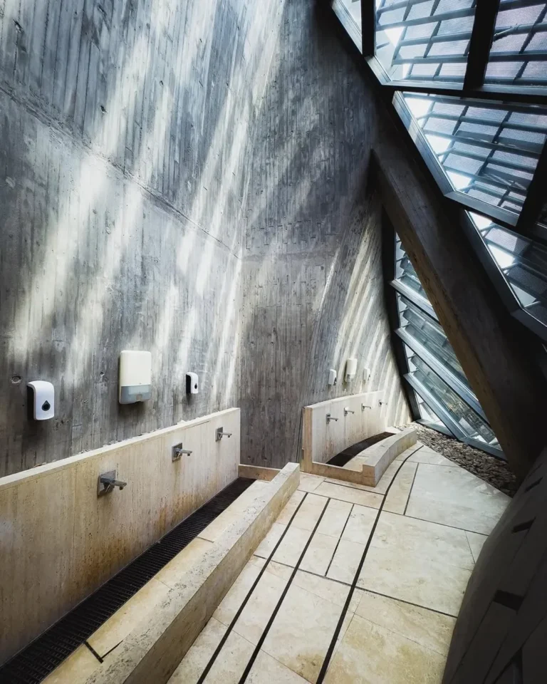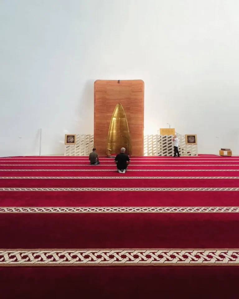 Masjid ini menggunakan struktur panel beton melengkung yang dipadukan dengan panel kaca untuk menciptakan permainan cahaya yang halus di ruang dalam. Beton bertindak sebagai elemen struktural utama, sementara kaca berfungsi menyalurkan cahaya matahari agar menyebar lembut ke seluruh ruangan. Kombinasi material ini menghadirkan atmosfer interior yang tenang, minimalis, dan tetap modern, tanpa menghilangkan kesakralan ruang ibadah.