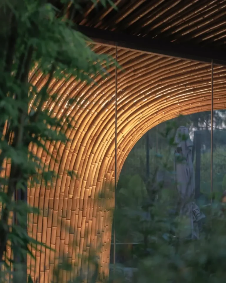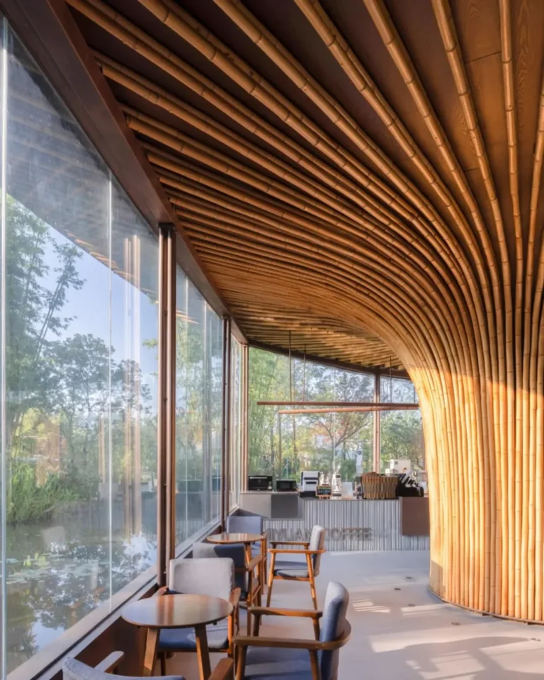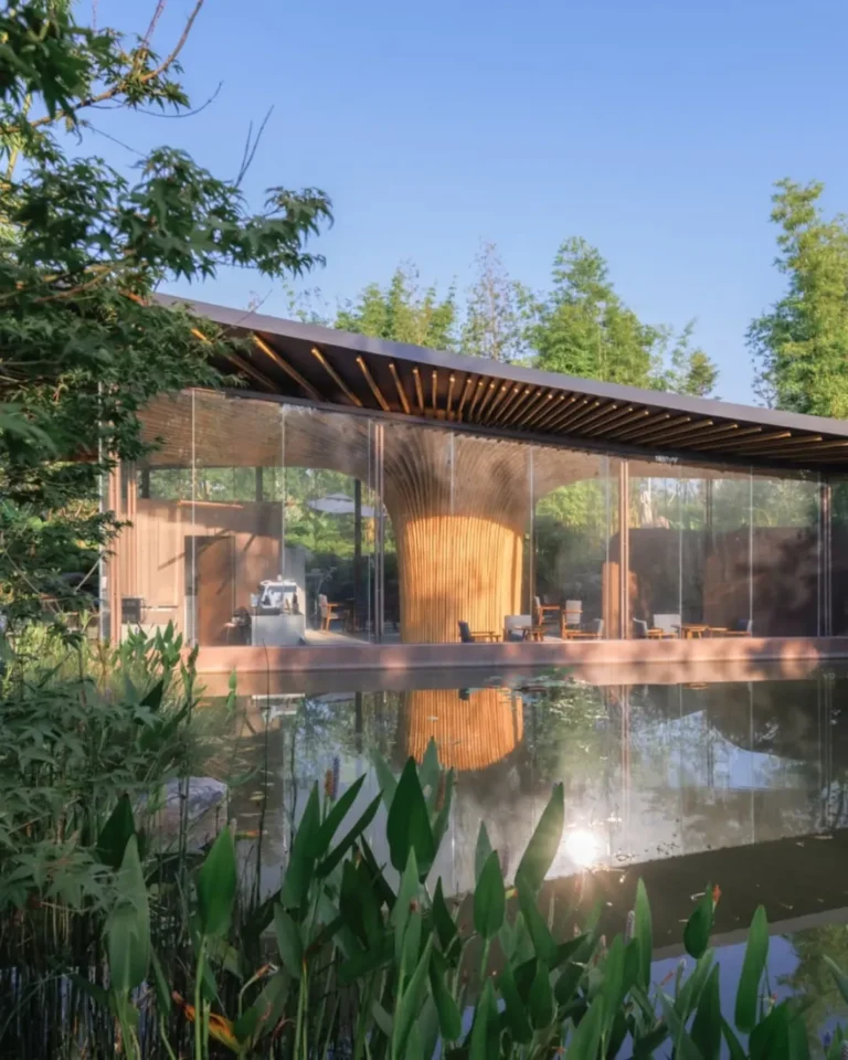 Bangunan utama dirancang menyerupai pavilion berbentuk daun lotus yang tampak melayang di atas permukaan kolam air. Di bawahnya, elemen bambu ditata menyerupai urat atau struktur penopang alami, menciptakan ilusi bahwa atap tersebut tumbuh dari lanskap. Hubungan visual antara air, bambu, dan bangunan menghasilkan pengalaman ruang yang tenang dan harmonis.