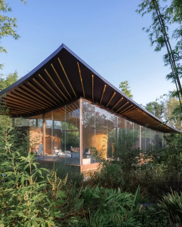 Karakter arsitektur tradisional Sichuan Barat diterjemahkan melalui atap lengkung yang ringan, teritisan panjang, serta detail struktural yang tipis dan presisi. Elemen-elemen ini biasanya ditemukan pada rumah tradisional setempat, namun diolah kembali menjadi komposisi yang lebih dramatis dan artistik. Hasilnya adalah bentuk pavilion yang tampak sederhana, tetapi kaya akan lapisan makna visual.
