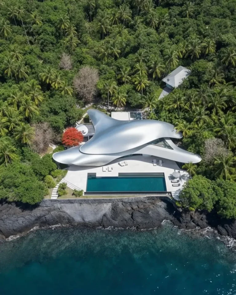 Hunian ini dirancang dengan pendekatan arsitektur organik-kontemporer, menampilkan massa bangunan menyerupai gelombang logam raksasa yang seolah muncul dari kontur tanah. Fasadnya didominasi material metal berfinishing matte dan panel kaca besar, yang berfungsi memantulkan cahaya alami sekaligus menyatu secara visual dengan warna laut dan hutan di sekitarnya. Secara visual, rumah ini lebih menyerupai instalasi seni skala arsitektural daripada rumah tinggal konvensional.